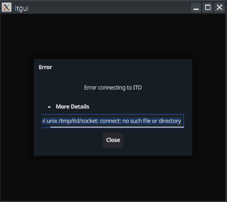 itguiI get the following error:Dial unix /tmp/itd/socket: connect: no such file or directoryIndeed there's no